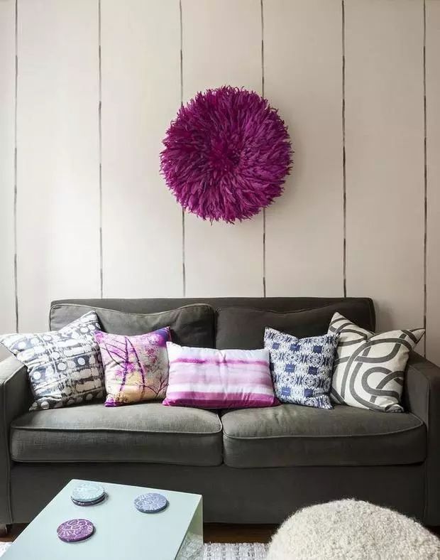 白色的墙面,深灰色的布艺沙发,这样的搭配很和谐,还有有些彩色系的抱枕,突出了一种艺术感。
