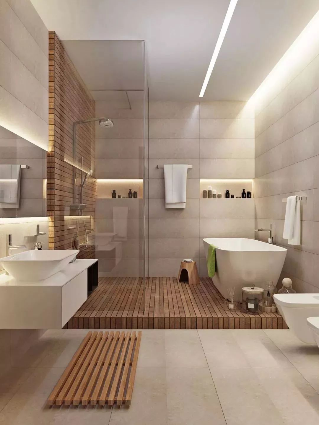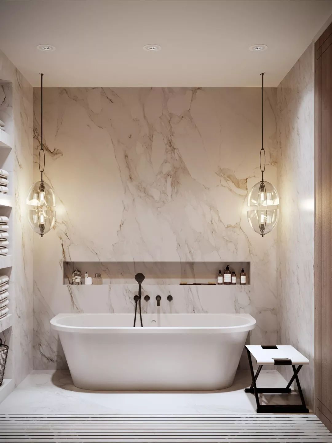 卫生间内可以做上多个壁龛,比如淋浴区和洗手台侧方都做上壁龛,这样收纳空间也能够多一些,给壁龛加装藏光的设计,看起来更为奢华、精致。