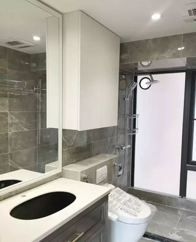 另外浴室柜上方要装一个大点的镜柜,为什么要大呢?一是镜面大能扩大视觉空间,二是增加收纳空间,护肤品、化妆品啊都可以塞进去,下方浴室柜台面也能整洁不少。