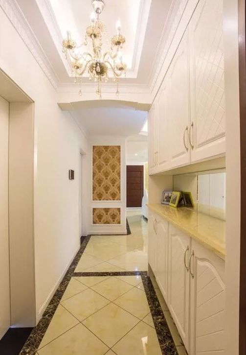 入户玄关处,定制了一个白色的置顶玄关柜,下面可以收纳鞋子,中间留出空间可以用来摆放一些装饰品,放置钥匙、包包等,非常实用。过道的水晶吊灯,很是精美,在灯光的照射下,让空间更加温馨。