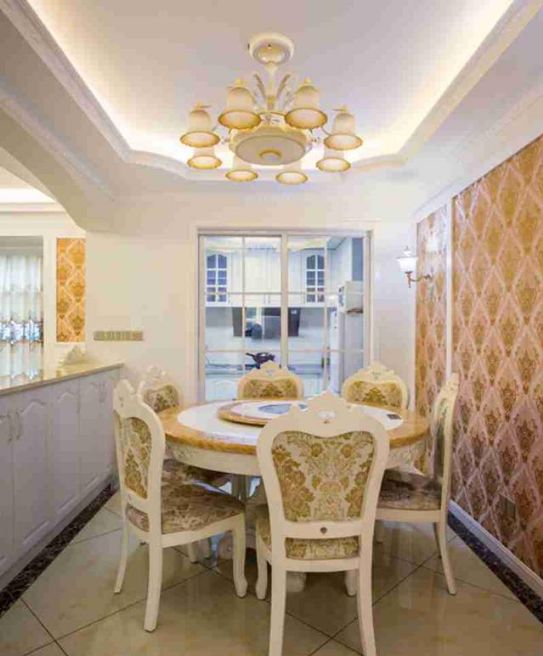 餐厅位于沙发后方,一排矮柜作为隔断的同时还增加了收纳空间;一张简欧圆形餐桌,大理石台面的餐桌方便打理,黄色花纹的壁纸跟餐桌椅特别搭调。