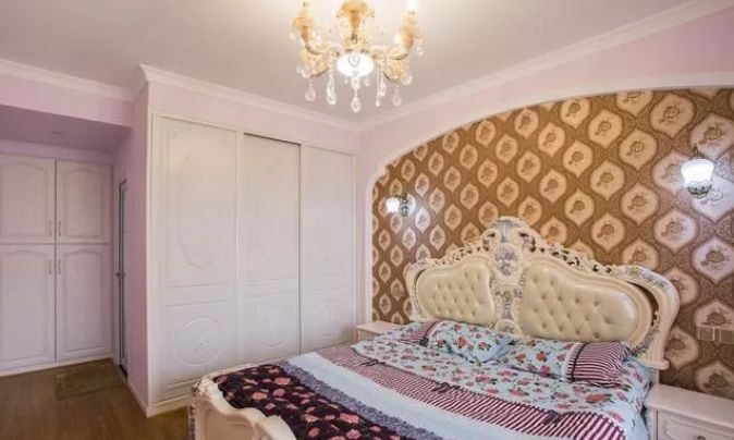 主卧,一张的原木欧式大床,华丽的花纹壁纸与同色系的窗帘遥相呼应。床边柜增加了储物空间,床尾化妆柜上方的置物架可以放化妆品和小首饰,既美观又实用。
