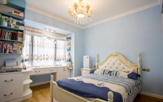 儿童房,以浅蓝色为主,舒适又清爽;搭配米白色的大衣柜和床,多了一些优雅的感觉。根据房间尺寸在靠窗区域定制的书柜和书桌,为孩子打造了一个安静的学习环境。柜体弧度设计,以免磕碰。