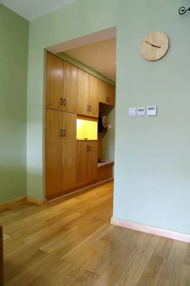 入户的玄关比较狭窄,鞋柜和坐柜的结合,使挂衣服、换鞋一步到位,既节省了空间,又非常实用。