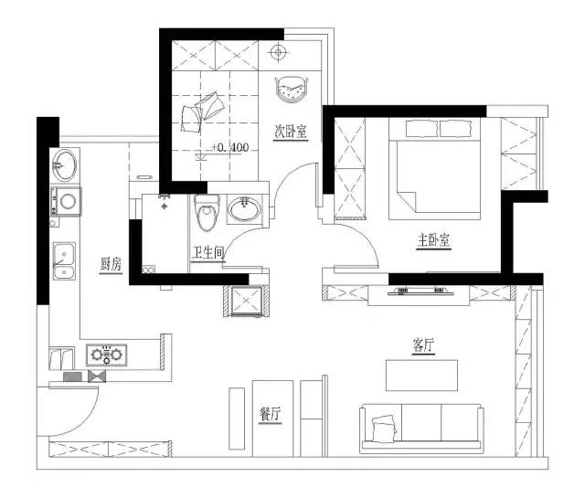 户型是小两房,因为是过渡房,所以房子两年以后会是父母来住,和业主沟通过后决定用不那么夸张的原木色系为基调来设计。