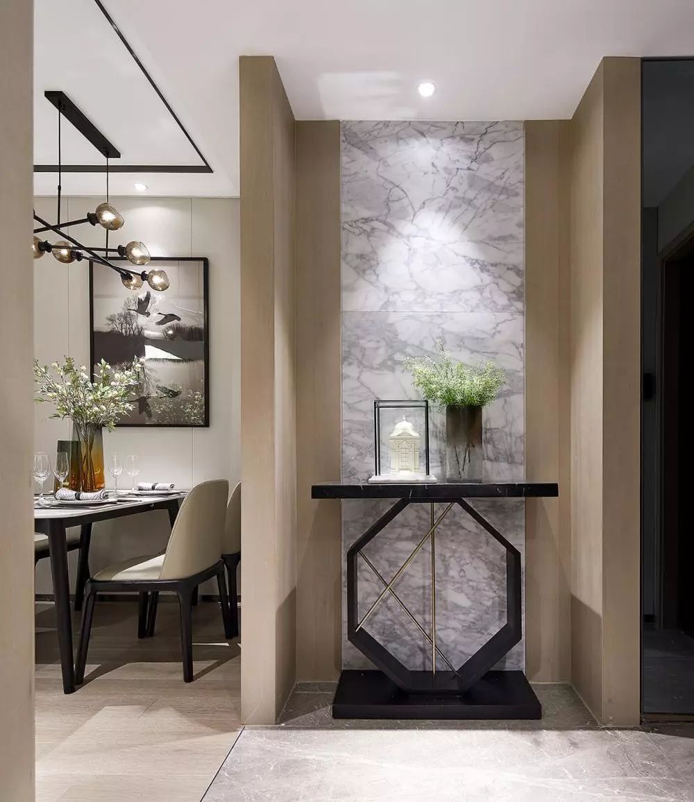 入户的玄关走廊处做了端景台的设计,用大理石作为端景台的背景,搭配简洁造型的装饰品和绿植,显得简单而又大方。
