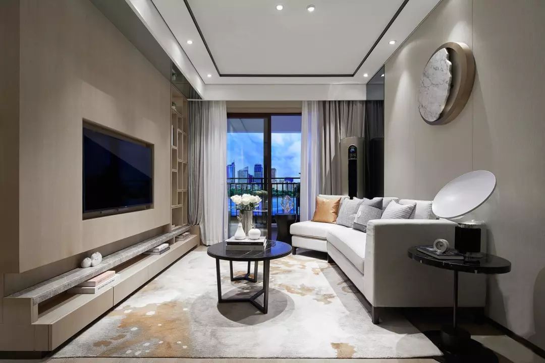 电视背景墙处做了嵌入式的设计,侧边还做了创意造型的开放式收纳,电视柜的造型也非常有趣。整个客厅铺贴了地毯,让舒适感翻倍。