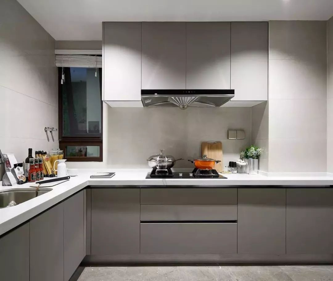 厨房内部用灰色调的柜子和地砖来搭配白色的墙面、台面。U字型的橱柜布局也能满足厨房的收纳需求。