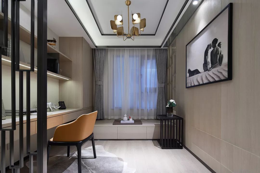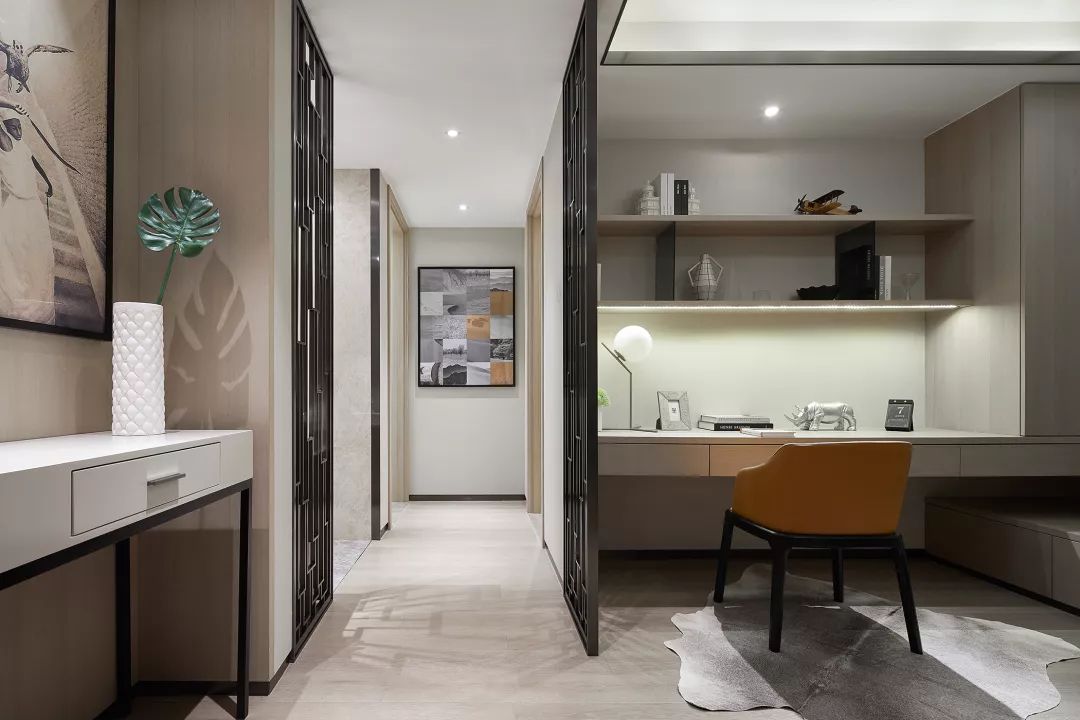 整个走廊过道运用了多个屏风,也利用户型的缺陷来摆放端景台。书房做了开放式的设计,空间更显宽敞。