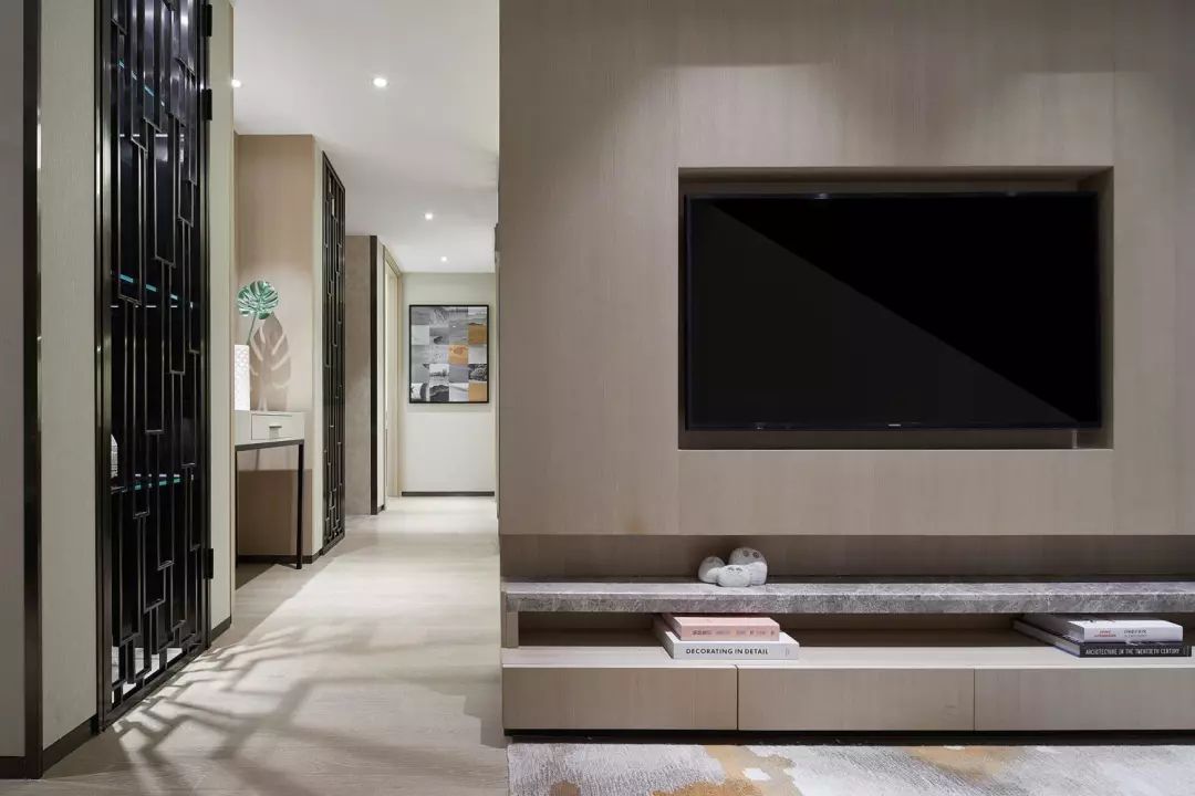 在客厅电视背景墙的后方就是通往卧室、卫生间的走廊过道,走廊过道里加上了屏风的设计,突显中式风的禅意感。