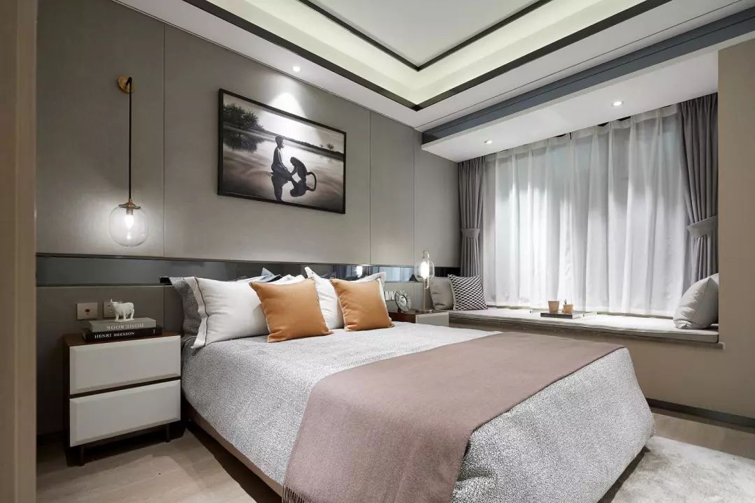 素雅大方的主卧空间,床头背景墙墙腰线处做了镜面设计作为点缀,中性色的软装搭配合适的灯光,让卧室空间变得更加的稳重、大气。