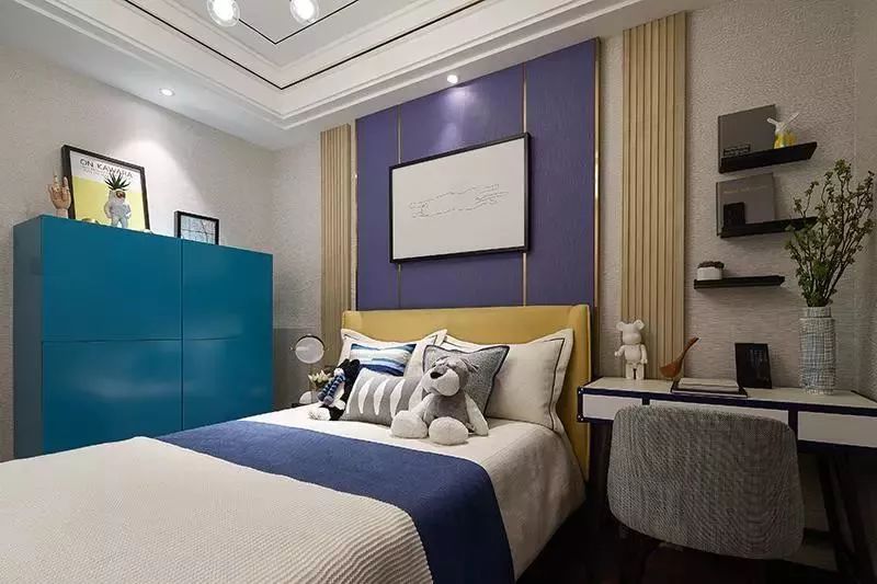 儿童房的设计会更具活力感,由孔雀蓝、紫色、和黄色补充跳跃感,呈现简单轻松的档次氛围。书桌柜代替了床头柜,更方便孩子平时使用。