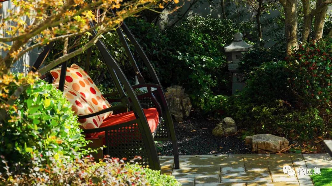 西侧植物组团的位置局部点缀日式景观,同时利用西侧的平台放置秋千,这里是儿童的天地,和草坪的结合在这里可以愉快地玩耍。