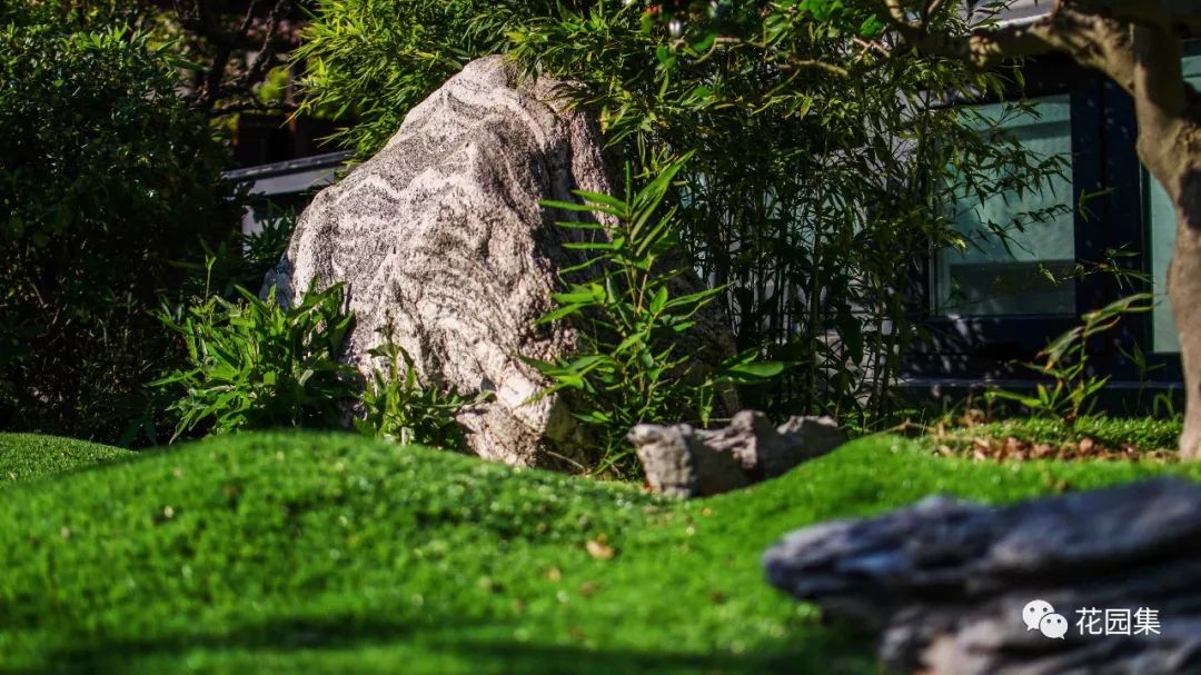 前院的位置往东走去,一条绵延曲折的园路带来曲径通幽处的感觉,两侧高低错落的植物相互迎合着起伏的地形,仿佛进入了另一个空间,庭院的主景石显得是那么的高大。