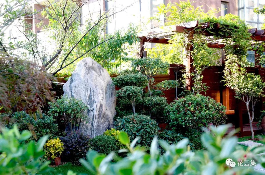 走进花园,首先映入眼帘的便是入院门口的景观石和入户门形成的对景,淡竹和造型植物的配合增加了入院的仪式感。