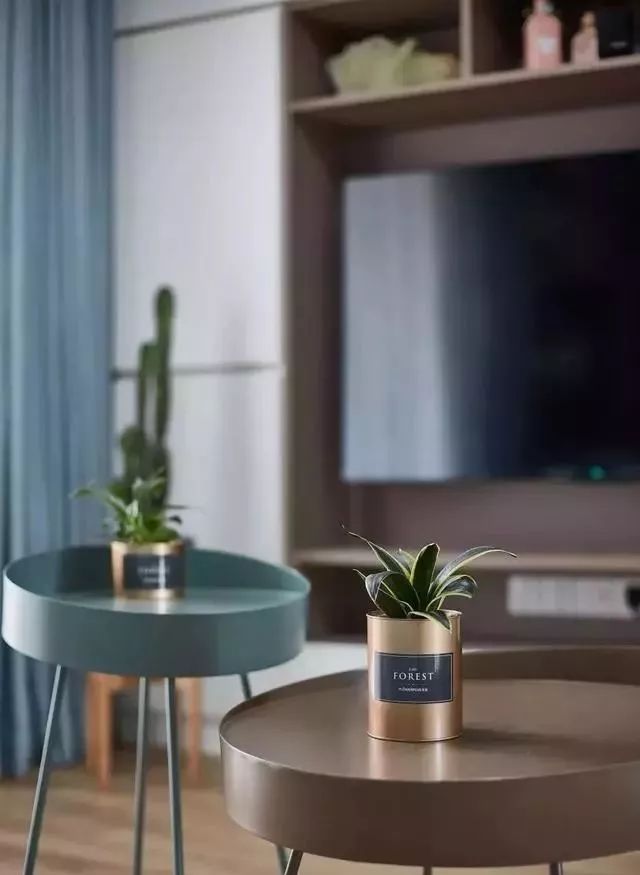 现在从整体拆开来看局部。这个是客厅,效果还不错,左边是沙发,因为没有靠墙,所以后面用了一方原木的置物柜做隔断,正好还能作为餐边柜使用,实在;右边的话,就是电视墙啦,选用电视柜作为背景,在我们看来好处在于,储物空间特别大,效果也简洁美观。