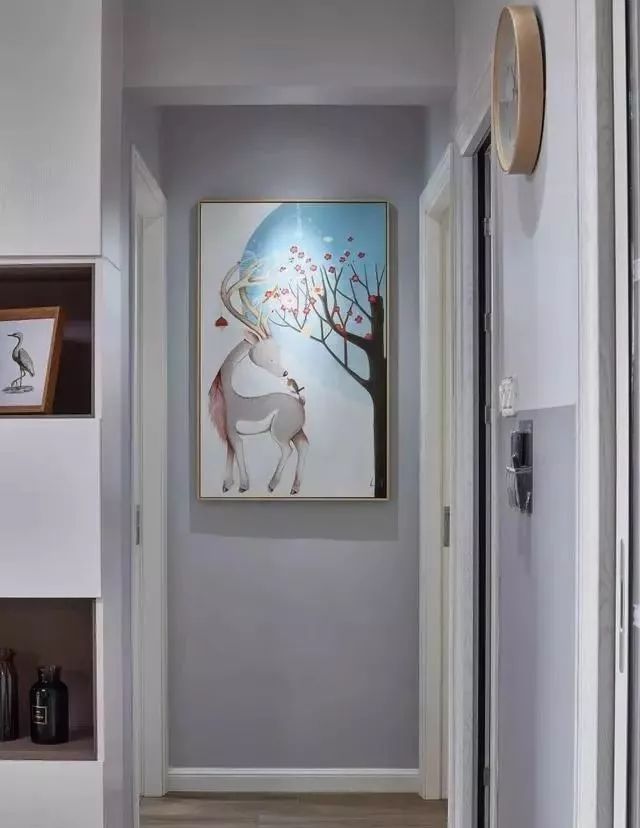 关于走廊过道,效果也很美观,比如虽然没有繁杂的装修,但是色调看着舒心,另外就是墙面的装饰画,很文艺,说是起到了四两拨千斤的效果也一点都不为过。