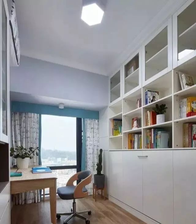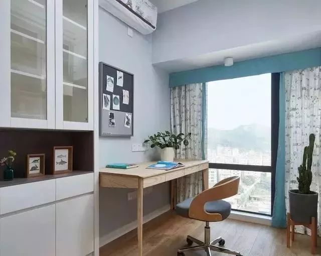 来到书房,位置就在客厅对面,采用玻璃移门作为隔断的,这样能让空间显得更为通透。另外,从内景效果来看,也显得挺简洁大方的,左边是书柜,配上一方原木的办公桌,看着很清新。另外,加上右边大面积的窗户,采光和视野特别好,试想一下学习工作累了,然后远眺一下远方,那是多么惬意啊!