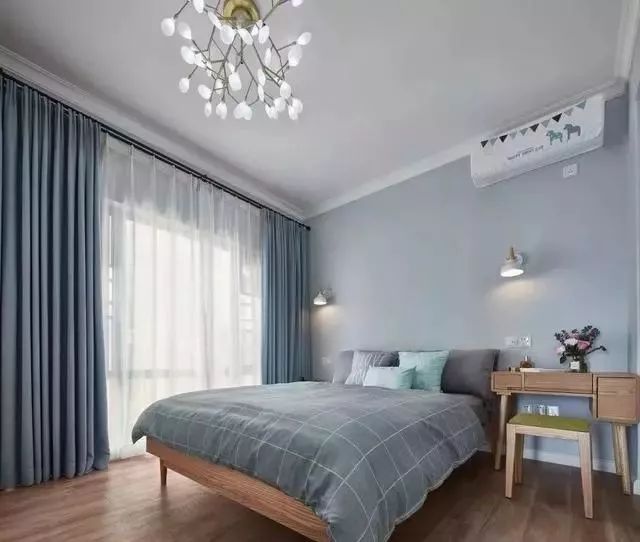 来到次卧,整体效果清新素雅,看着很舒适,比如墙面的装饰画不错,文艺范十足,也有飘窗,采光和视野也行。另外就是床,靠墙摆放,这样能够腾出更多的空间以备它用。