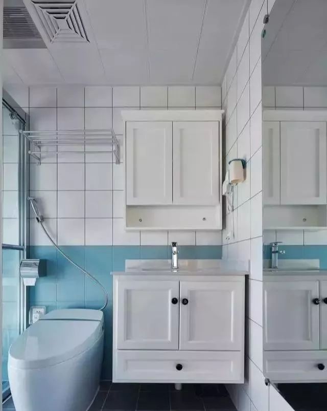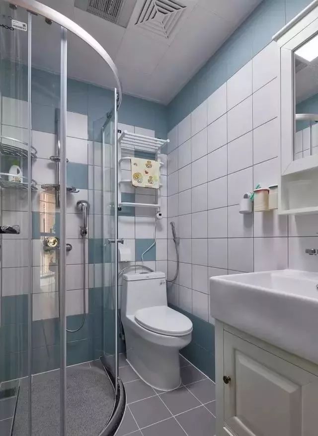 最后我们来看公卫,虽然布局有些紧凑,但空间利用率高,而且就以装饰效果来看,蓝白相间加灰色地砖,既清爽也时尚