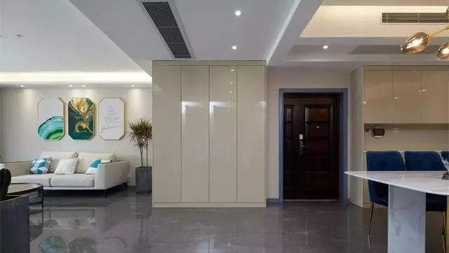 由于没有独立的玄关空间,所以这里便借用过道做了一个很大的收纳柜,当然也包括鞋子的收纳。而且还是米黄色的亮面柜,看着很舒适也有档次呢!然后一边是客厅,一边是餐厅、厨房。