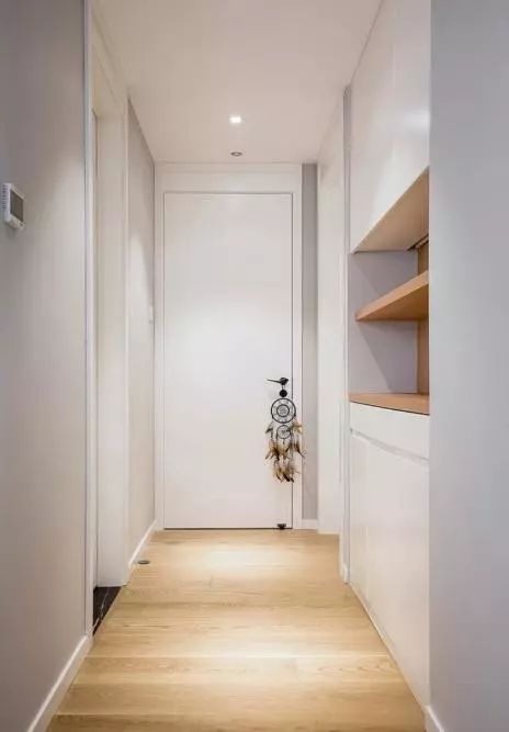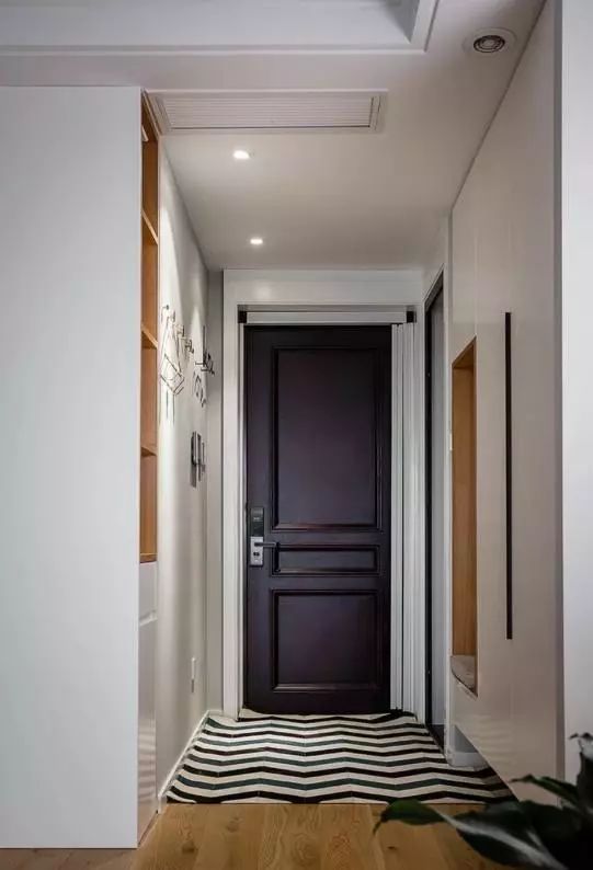 进屋的空间特别的实用,左边的餐边柜沿着墙体装的和过道平行,从侧面开口,增加了不少壁龛形式的储物空间。地面是实木地板,铺上一层温馨的小地垫,干净又卫生。入户门的右边是厨房门以及我家的定制鞋柜,鞋柜一直设计到顶,不过在底部留空,还预留了一个可以坐人换鞋的区域,非常的实用。