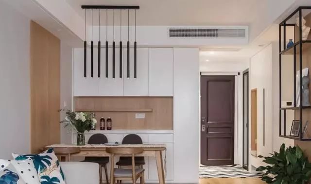 走进来之后是我家餐厅区域,餐厅的极简吊顶是我们网购的。灯具厚重造型多,反而会给人压抑的感觉,简单的线条吊灯营造出一种轻松极简的氛围。左边用一块护墙板装饰,我们考虑的比较周到。餐桌靠墙难免会磕碰到墙面,做一层护墙板既是装饰也是保护,搭配原木的餐桌椅很舒适温馨。背后是一组餐边柜,增加了不少储物收纳功能。