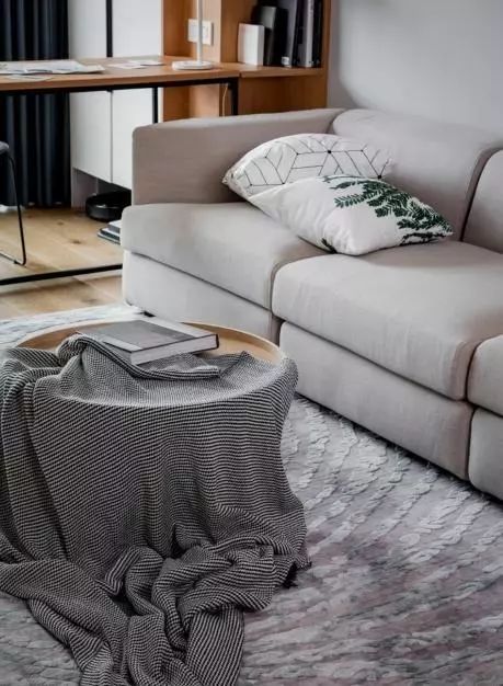我们没有买成品的电视柜,电视机下面的固定收纳柜都是木工师傅现场制作的,而左边的区域做了黑色的铁艺支架,可以用来陈列收纳,比如一些装饰品,植物等等。黑色的线条也可以增强房子整体装修的轻快感。左边的沙发墙,涂刷了灰色的乳胶漆,灰色属于一种百搭高级色。而且非常适合搭配木色家具比较多的房间。