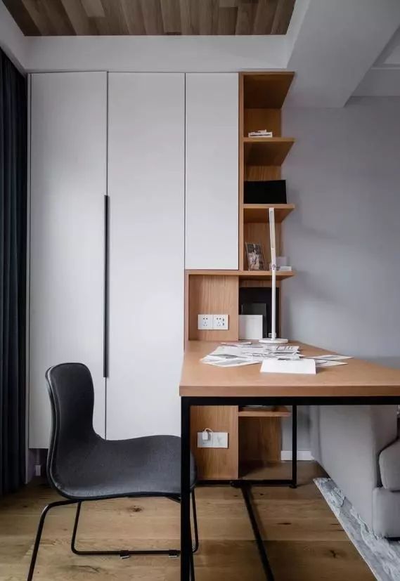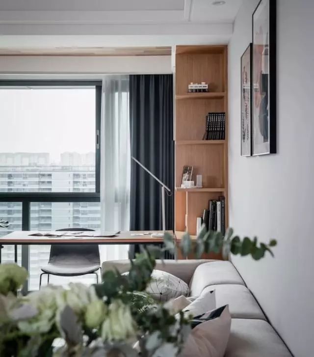 客厅阳台打通、内包进客厅。让客厅显得更大气,在这里我们用木质地板纹路的壁纸铺贴吊顶,侧面定制一体式的顶天立地书柜和延伸书桌,让这里变成了一个独立的个性的办公空间。