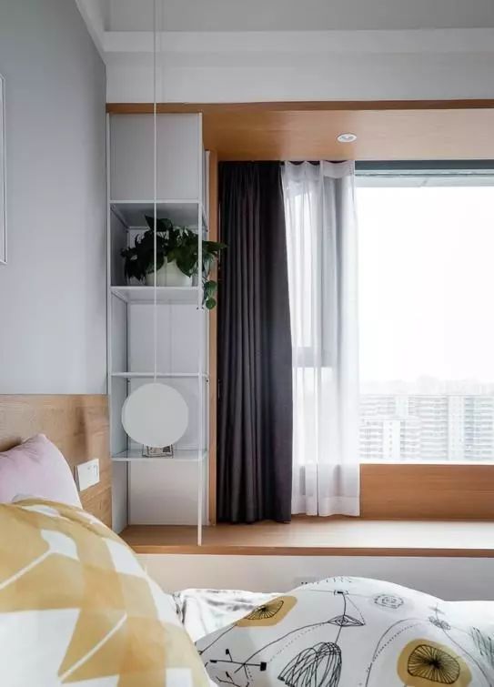 侧面的飘窗最实用,铺上实木板收口很有质感,线条材质都很舒适。左边的空间也利用起来,装了一些收纳展示小格子。