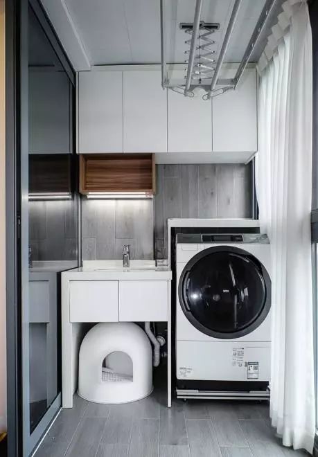 阳台的设计也很不错,看着特别的舒适整洁,水槽下面留了一个空间,放猫窝(我妈养的)。
