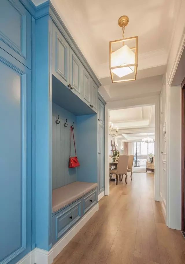 ✪浅蓝色整体玄关柜实用性很强,充分利用了门厅空间。具有金属感的暖色调顶灯,让单调的天花板一下子精致起来。