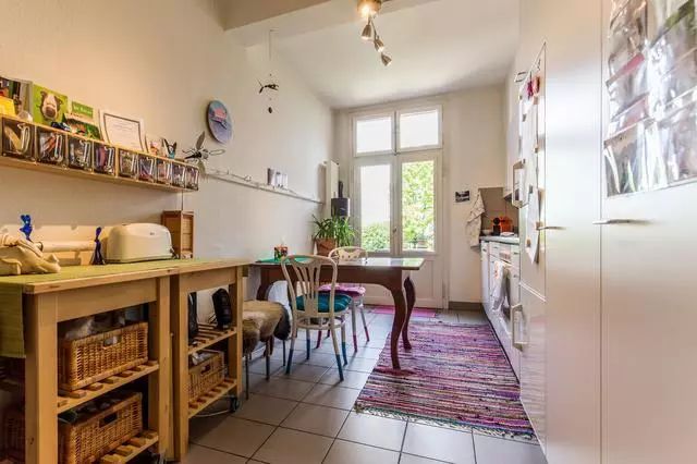 厨房也兼具了工作间的功能,摆放着很多手工工具,相册、海报等等都被归置在墙上的储物格里,彩色的地毯搭配纯白的橱柜,众多撞色搭配在一起,不但不抢眼,反而非常养眼。