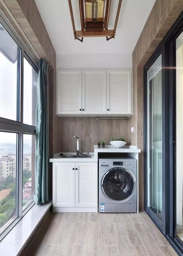 家里有阳台的朋友不防做一个吊柜,并且可以在阳台做一个洗漱台和洗衣机柜,这样方便晒衣服,并且可以缓解家里洗漱紧张。