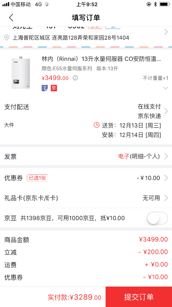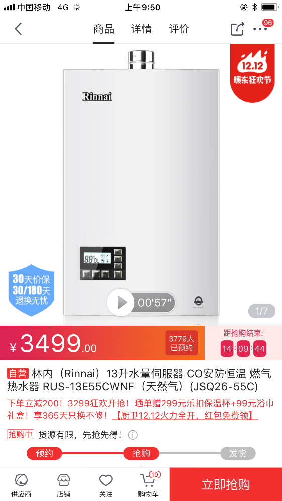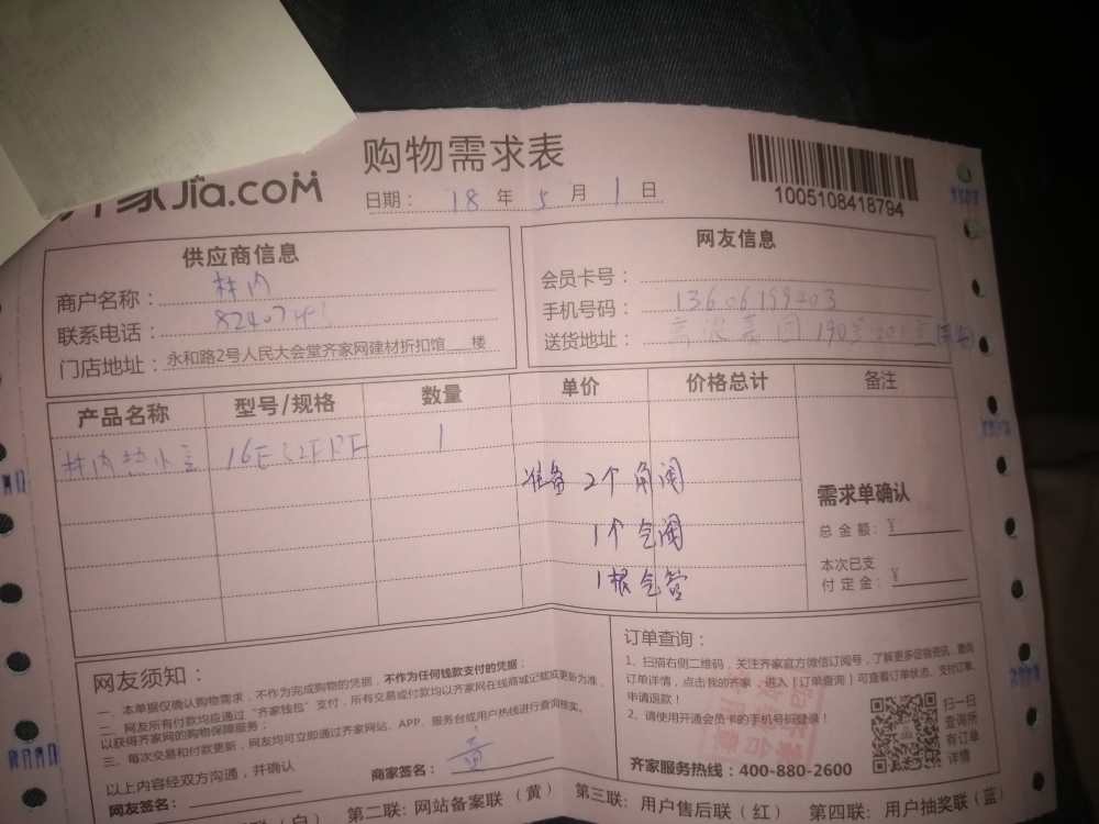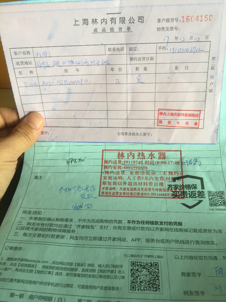 #上海“价格保”专属贴#12月10号在齐家建材市场祁连山路地铁站购买林内热水器13E55CWNF(T)型号,价格3599元。同时参加店内购买三个品牌价格(欧派木门、欧睿宇邦、林内热水器)返现金400元活动,相当于每个品牌优惠133.3元,林内燃气热水器相当于3599-133.3=3465.7元,但是京东双十二活动价格3499,并且下单立减200元,相当于3299。加上京东赠送的优惠券10元,要比在齐家购买同一型号林内热水器便宜176.7元齐家这款产品的,经过电话咨询400客服安装费用为5米内人工免费,超出5米,每米人工费5元,材料费用为57元和63元每米的两种型号,按照我家5米长管道布排,一共需要285元和315元。京东所有人工加材料费用300元封顶。综合比较安装方面齐家和京东相差不多,但是机器总价京东更便宜,而且京东还额外赠送299乐扣和99元浴巾礼盒