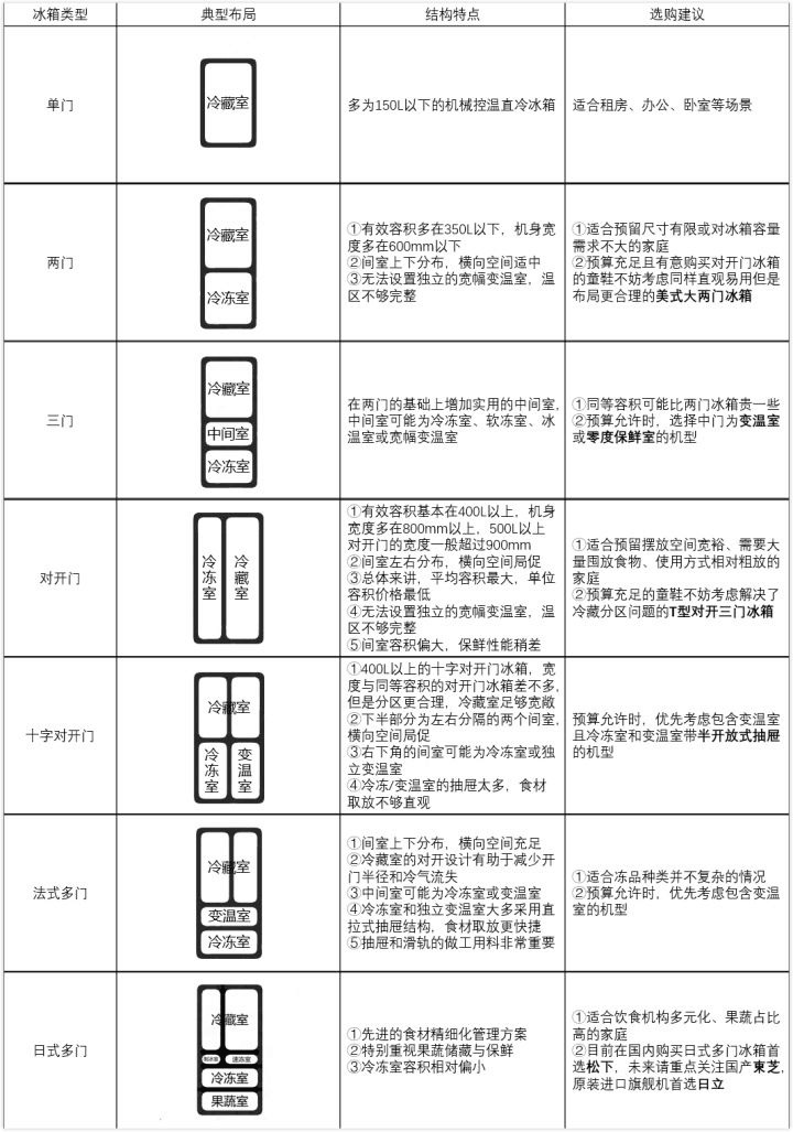 电冰箱在我心里的位置还蛮高的,虽然比不上空调那么重要哈哈哈,但是冰饮蔬菜水果的储存还是特别重要的。说在最前面的话,千金难买爷高兴,如果家人或者你自己有特别喜欢的款式,基本就先买了再说,也不是个特别昂贵的电器,这篇指引只针对从实用性等角度去挑选的方式。一、冰箱的尺寸、容积与箱门形式1.预留位置与容积需求2.箱门形式二、冰箱的结构原理、技术类型与功能参数1.冰箱的基本结构与工作原理2.冰箱的技术类型(1)直冷、风冷与混冷(2)单循环与多循环(3)定频与变频一、冰箱的尺寸、容积与箱门形式尺寸是选购冰箱首先面临的问题。可选尺寸的上限和下限分别由预留空间和容积需求决定。1.预留位置与容积需求新家装修建议在设计阶段就给冰箱预留合适的摆放位置与充足的摆放空间。合理的动线设计应当保证“备料→清洗→加工→烹饪”这一流程的顺畅高效。由此可见,冰箱的摆放位置,优先级为厨房>餐厅>客厅。理论上为保证散热和开门方便,冰箱放置时建议两侧和背部各预留10cm左右的距离。实际上由于设计冗余的存在和散热结构的改进,在保证箱门正常开启的前提下,两侧各预留5cm左右即可。底部散热型冰箱仅需各预留2cm。在空间允许的前提下,建议参考100~150L/人的标准,结合家庭食材购买频率,确定容积需求。记住,冰箱的本质是“时间管理工具”。2.箱门形式冰箱按箱门形式分为单门、两门、三门、对开门和多门(包括十字对开门、法式多门、日式多门等)。日本并没有“日式多门”之说法,他们仍将其定义为法式多门冰箱。本文称之为“日式多门冰箱”,目的是将这种经过岛国本土化改良的多门冰箱与传统法式冰箱加以区分。