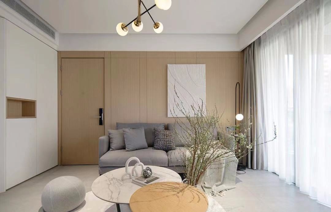 木饰面背景墙将沙发区域包围,包括门的材质保持一致性,让沙发背景墙形成一个整体。