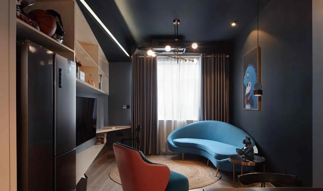 86㎡工业风格装修,空间中运用了大面积的深色做为背景,非常的炫酷,设计师加入了色彩饱和度较高的橙色、蓝色做为点缀,让空间有了多彩的一面,整体的个性感也更强烈。