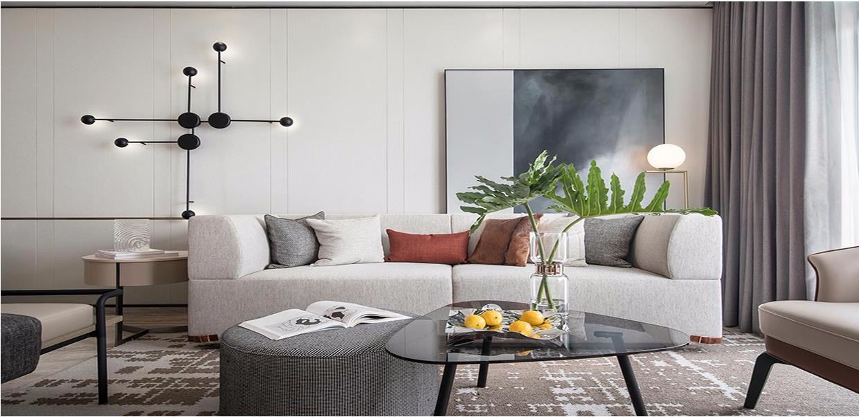 本案原始结构南北通透,房型方正、功能分区明确,结构上设计师只做了细节方面的调整,让空间动线更加合理,使居住者在使用上更加便利。本案为现代极简风,效果表现上,设计师驾轻就熟的运用了椭圆、圆形、方形等几何图形及线条,以奶白、浅咖等奶茶色系为全屋奠定了温暖色调,点缀橙色、黄色、蓝色等色彩;精心挑选了极细腿部设计的家具,强化了极简风格,让整个空间主次分明。