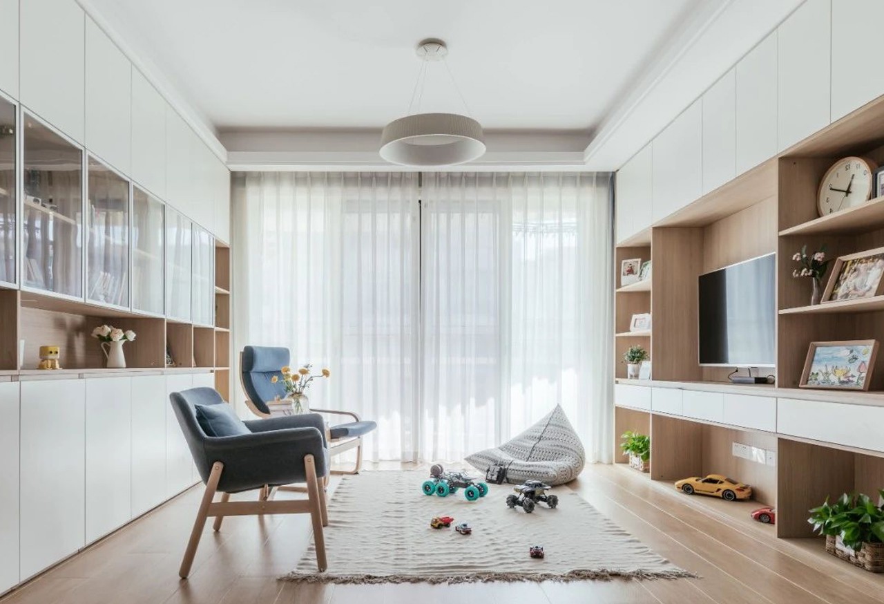 原木、白色及柔和的中性色的搭配,营种出明亮而温馨的空间氛围。客厅两面墙都做了大量的定制柜,极大程度的满足了空间的实用性。