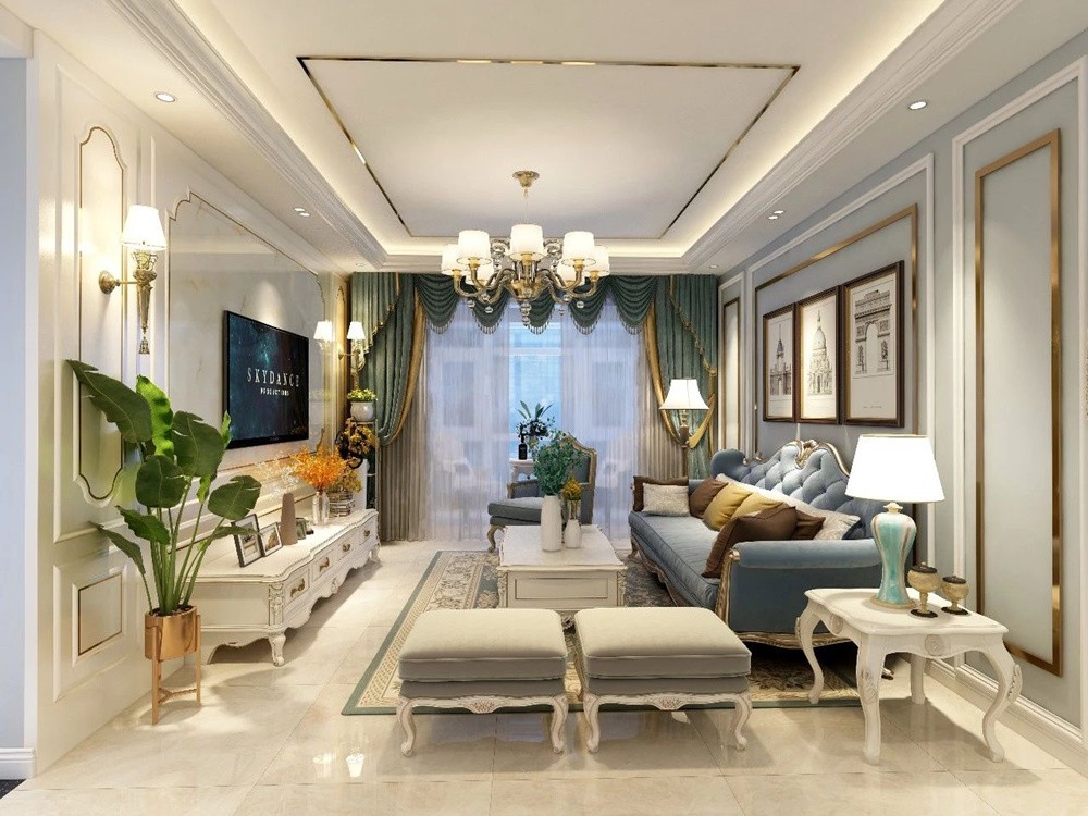 客厅整体采用简欧风格色调,家具以及定制柜搭配,整体的客厅蓝色墙面乳胶漆与香槟色不锈钢线条搭配,沙发墙也考虑了白色石膏线条与香槟色不锈钢线条的搭配来体验简欧风格的奢华感。