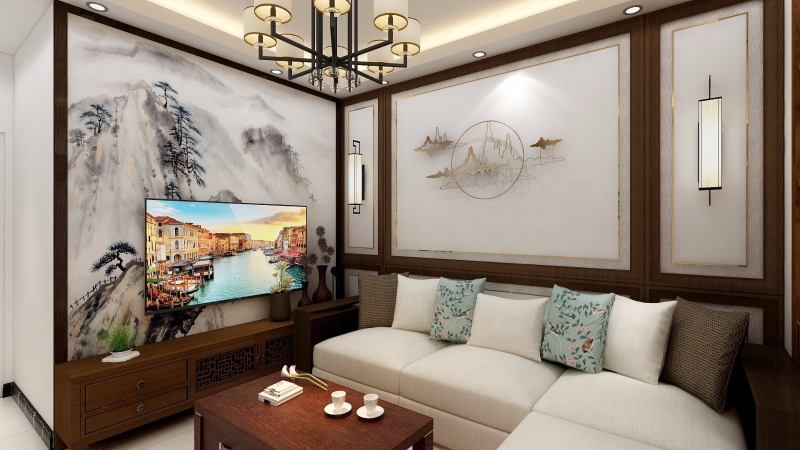 本户型是一个三房两厅一厨一卫一大院的户型,阳光充足,通风好,风格设计的是中式风格。