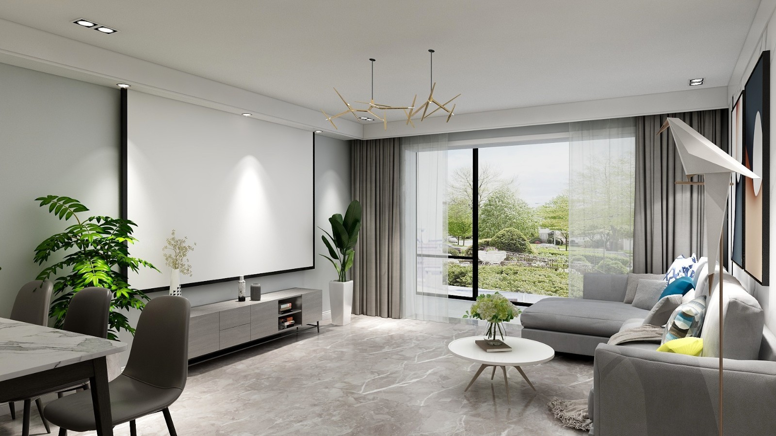 客厅简洁大方,安装电动幕布