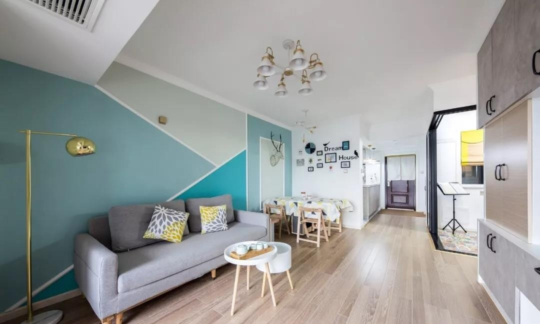 这是一套面积为76平米两居案例,有点工业风的味道,更多的是简约轻快的北欧风为主,以清新明快的色块,营造了一种年轻活泼的空间氛围。