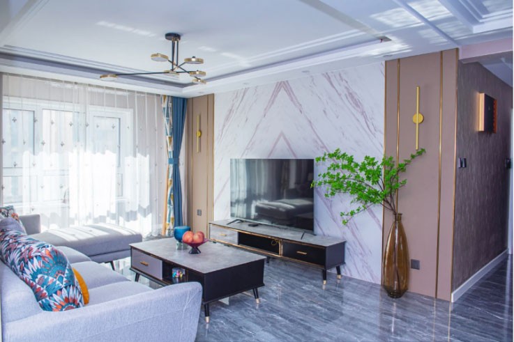 客厅色彩搭配细节上,采用灰与白奠定空间的主基调,简单的线条丰盈客厅的立体感,大理石背景墙成就了整体的品质感。去除繁复,反而更有***范儿。光线透过纱帘照射到屋内,营造温馨舒适的空间氛围。