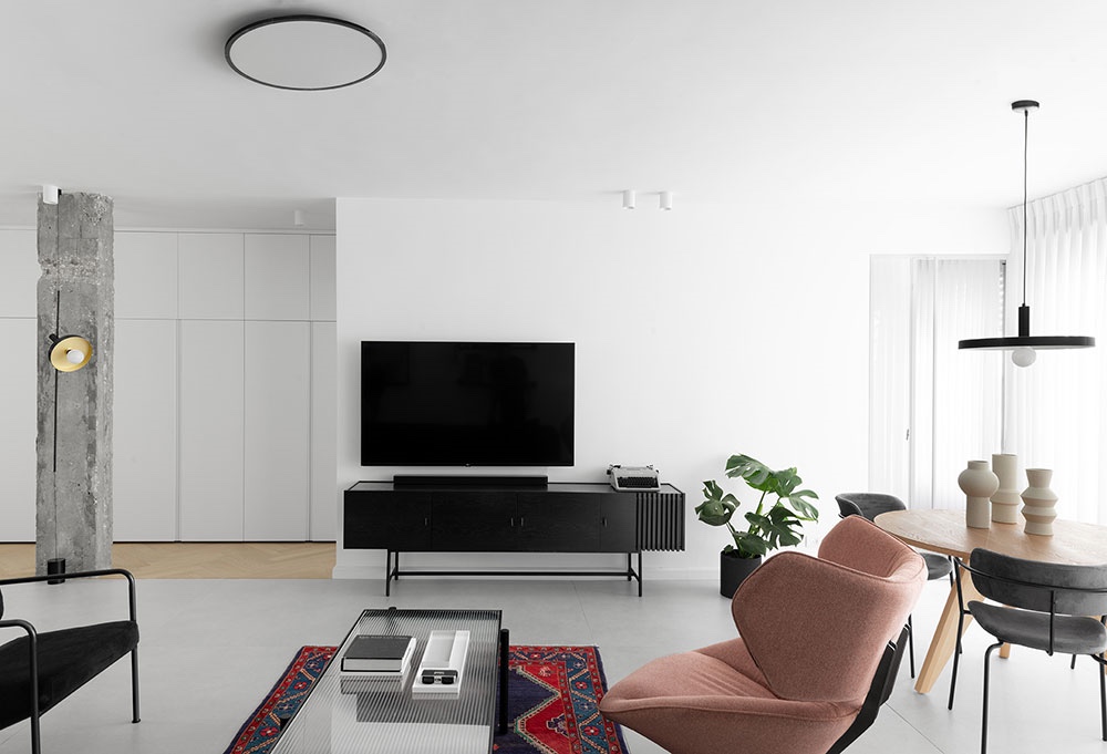 客厅没做吊顶,天花板仅以外露筒灯 视觉上更显,业主和设计师 不约而同地选择了简约的白色饰面 。