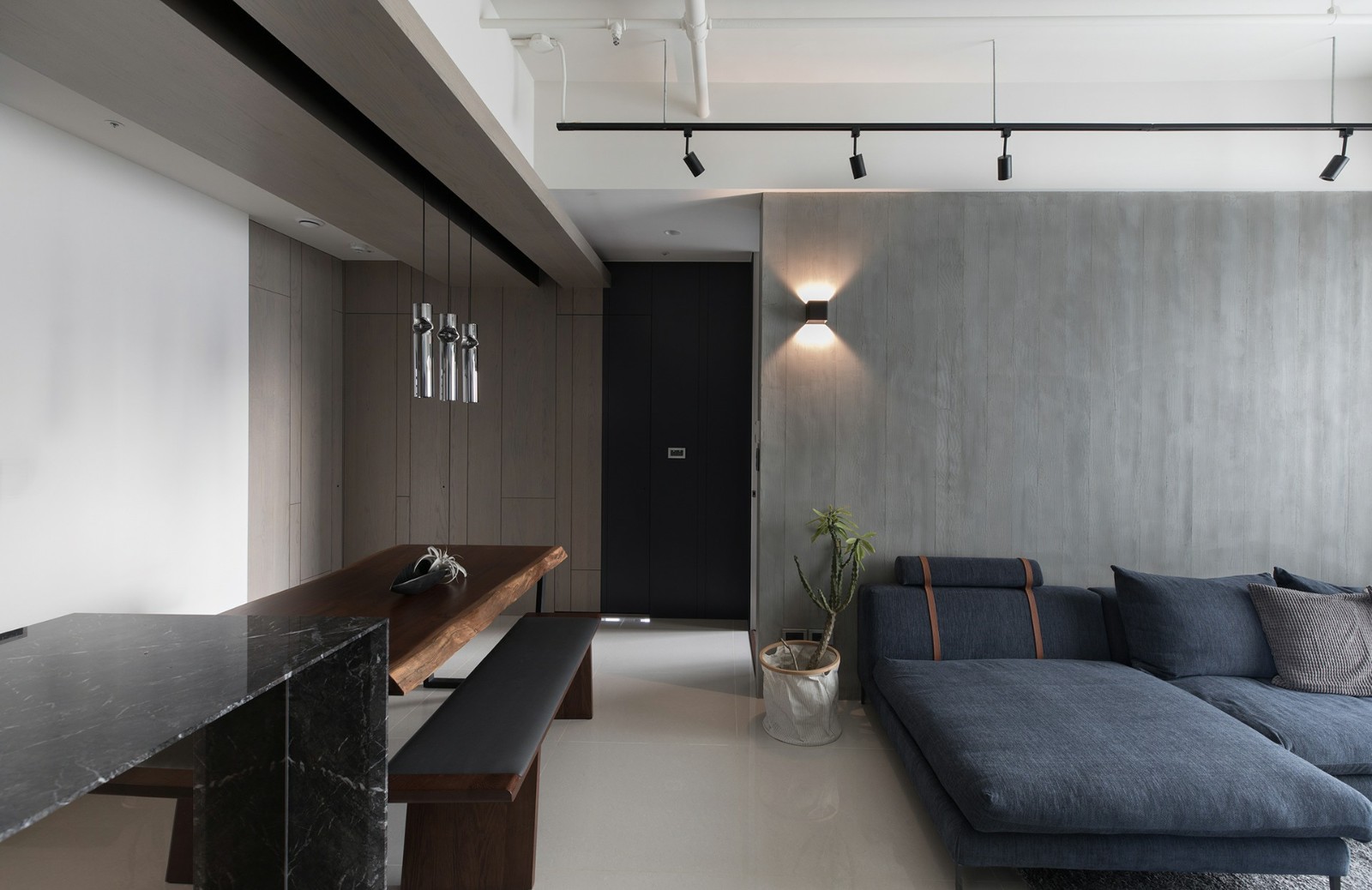 深邃的黑与皎洁的白相互融合,简洁的水泥漆将空间的轻松惬意解放出来、深加工的科技木皮丰富了空间在视觉上的延展力,赋予空间绵绵不尽的诗意想象