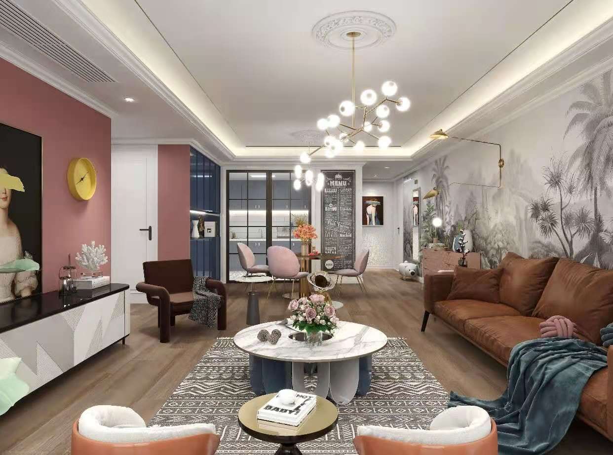 粉色背景墙 沙发墙采用了整张壁画 凸显风格的大方得体