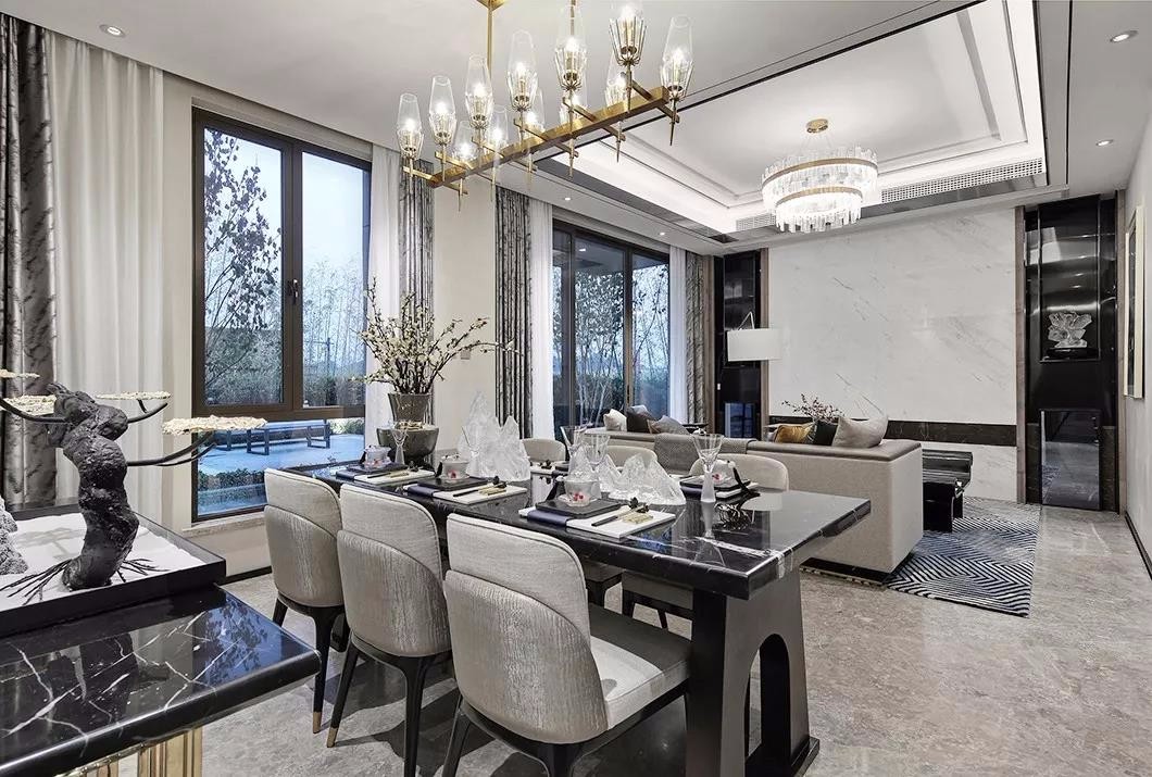 运用干脆利落的线条搭配简单明亮的新现代装饰元素,整个空间以灰白色统筹,吊顶配以晶莹透明的琉璃装饰灯,饰以镜面锆金镶边,散发着低调奢华气息。