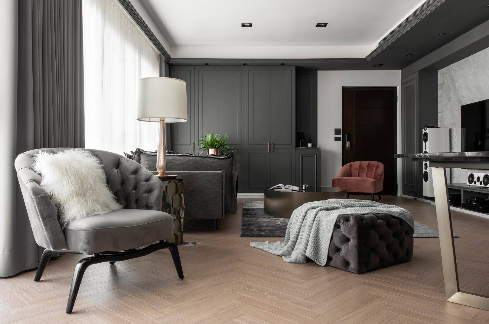 在轻美式风格与现代摩登中,碰撞出唯美奢华质感。 并以线板与沟缝刻划细腻的层次,而扮演融合角色的【灰】,衬托出金色不凡的尊荣感。